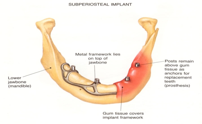 A Blade implant supporting a bridgeSub-periosteal. This type of implant does not go into the jaw bone, but it sits in top of the jaw bone, under the gum. The gum has to be lifted (under anesthetic) to allow the implant framework to be fittd over the bone. The gum is then stitched back into place, and it heals up to hold the implant firmly in place. More details below.